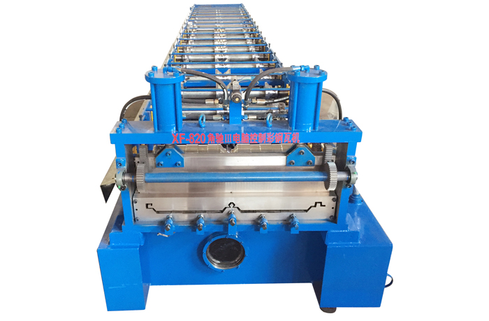 1、成形主机:机架为396H钢焊接而成,墙板式结构,链轮链条传动,19道滚压成型(1-8为通轴),电机功率18.5KW,成型速度20米/分,外形尺寸:9.6米×1.4米×0.9米,整机重量为:5.8吨。